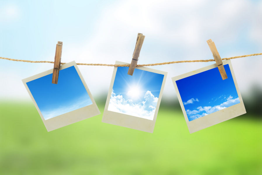Three instant photos with sky inside hanging on the clothesline